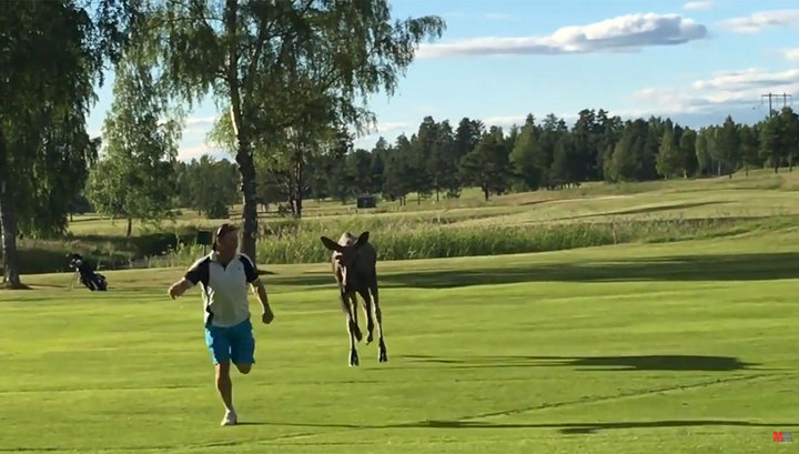 Молодой лось пришел на поле для гольфа в Швеции и попытался сыграть в догонялки с одним из игроков.