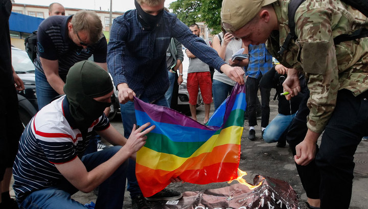 В Киеве во время проведения гей-парада произошли новые стычки. С одной стороны - националисты с участниками карательной операции на востоке, с другой — представители ЛГБТ-сообщества. Под стандартные выкрики и лозунги националисты отобрали флаг у сторонников нетрадиционной ориентации.