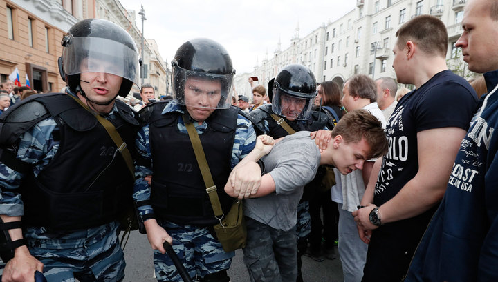 Момент нанесения удара, предположительно, ножом в спину сотрудника ОМОНа на несогласованной акции протеста 12 июня на Марсовом поле в Санкт-Петербурге попал на запись видеокамеры.