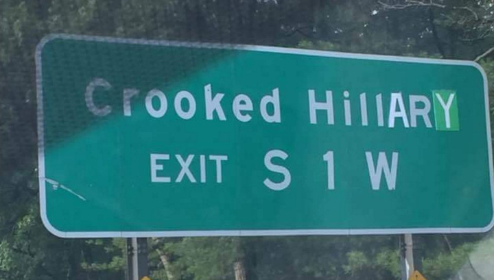 Неизвестные добавили на дорожный указатель, обозначающий направление к улице Crooked Hill Road в одном из пригородов Нью-Йорка еще три буквы, так что название улицы стало в приблизительном переводе обозначать "Улица Пронырливой Хиллари".