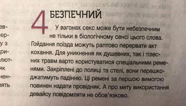 В печатной газете Украинских железных дорог ("Укрзализныця") под названием "Магистраль-Экспресс" опубликована инструкция о том, как безопасно заниматься сексом в поезде, а также спецпредложения для желающих испытать новые ощущения.