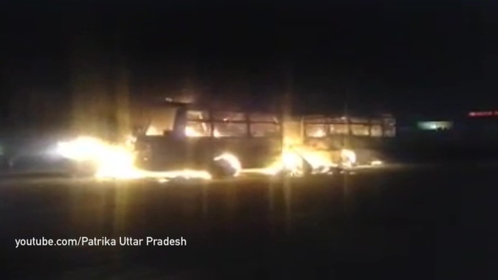 22 пассажира автобуса сгорели заживо в Индии. Трагедия произошла ночью недалеко от города Барели. По предварительным данным автобус выехал на встречную полосу, где столкнулся с грузовиком, после чего дизельный бак пассажирского транспорта взорвался.