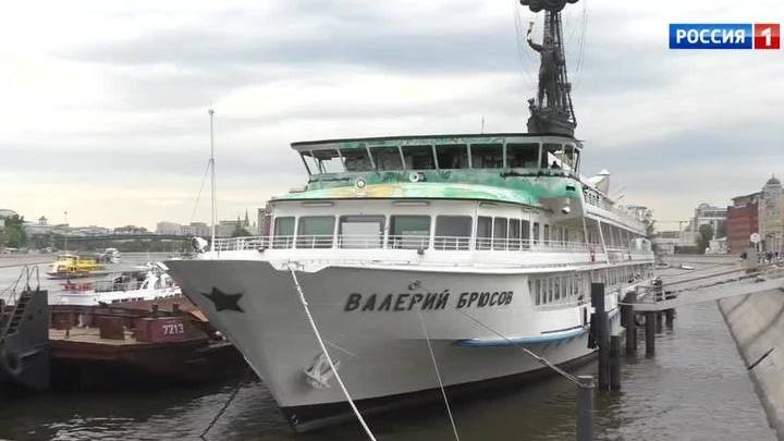 Теплоход "Валерий Брюсов" готовится навсегда покинуть Крымскую набережную. Чтобы теплоход мог пройти под мостами Москвы-реки, придется демонтировать часть верхней палубы.