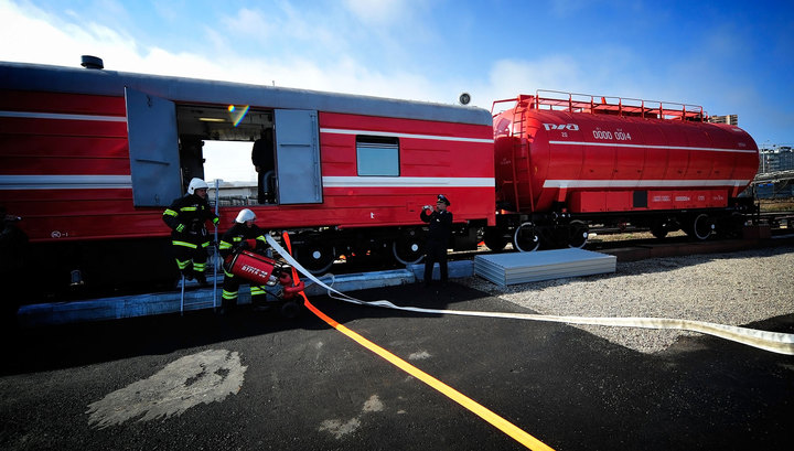 Горящий склад в Подмосковье тушат с пожарного поезда